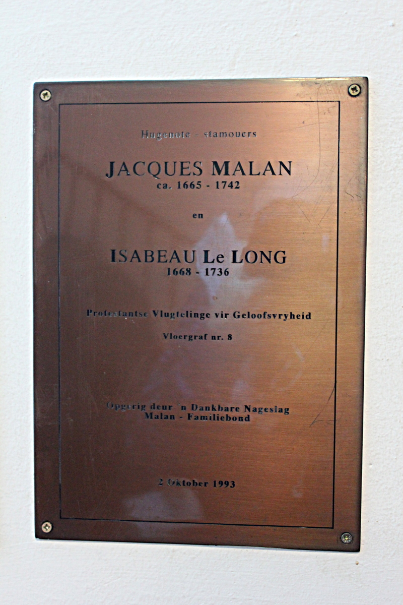 Die gedenkplaat wat ter herinnering aan die Malan-stamouers opgerig is. Dit lui as volg: Hugenote stamouers JACQUES MALAN ca. 1665 - 1742 en ISABEAU Le LONG 1668 - 1736 Protestante Vlugtelinge vir Geloofsvryheid Vloergraf nr. 8 Opgerig deur 'n Dankbare Nageslag Malan-Familiebond 2 Oktober 1993 |