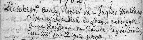 Elisabeth Anna, is gebore op 30 November 1701. Sy is gedoop te Stellenbosch op 22 Januarie 1702. Die getuies by haar doop was Daniel Hugo en sy vrou Anna Rousseau.