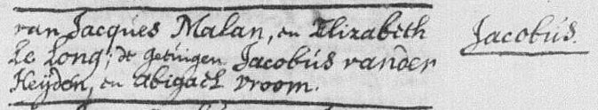 Jacobus, is gebore op 8 November 1710. Hy is gedoop te Kaapstad op 14 Desember 1710. Die getuies is Jacobus van der Heyden en sy vrou Abigail Vroom. Jacobus was die latere eienaar van Lourensford en dit kom voor dat Jacques hom moes geken het voor Jacques die plaas Morgenster in 1711 gekoop het.